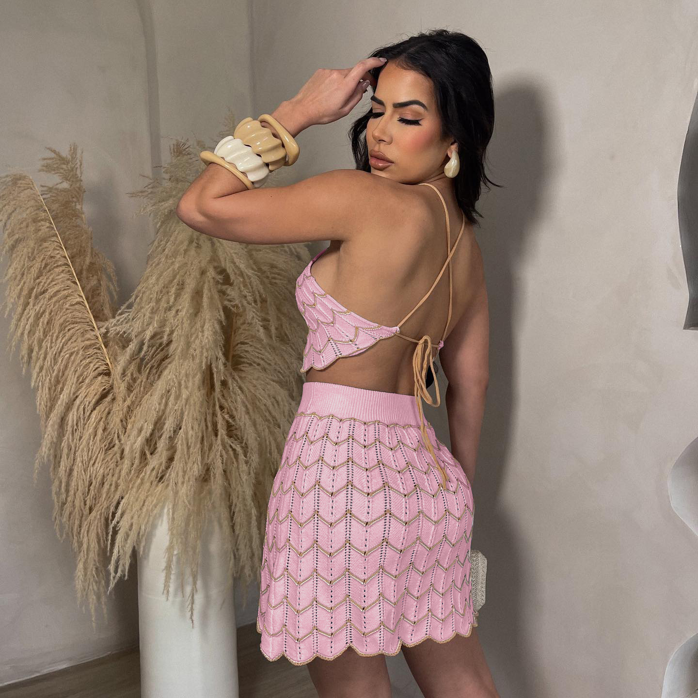 Home>Products>Women>Clothes>Dress>Summer>AJ4452 Cross border Platform European and American Women's Knitted Elastic Sports Casual Skirt Sweater Short Set
