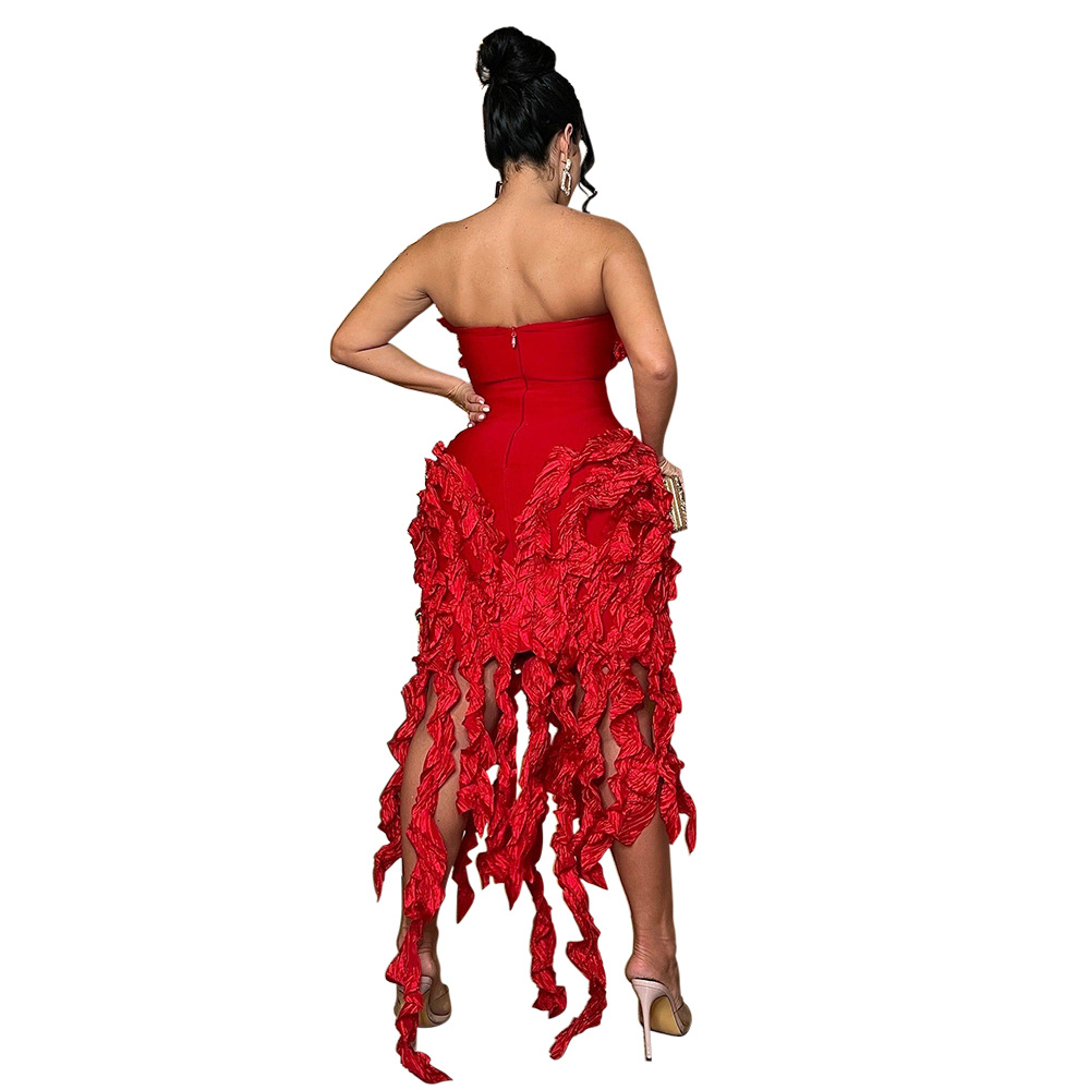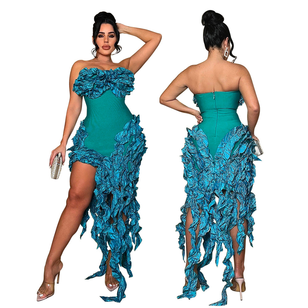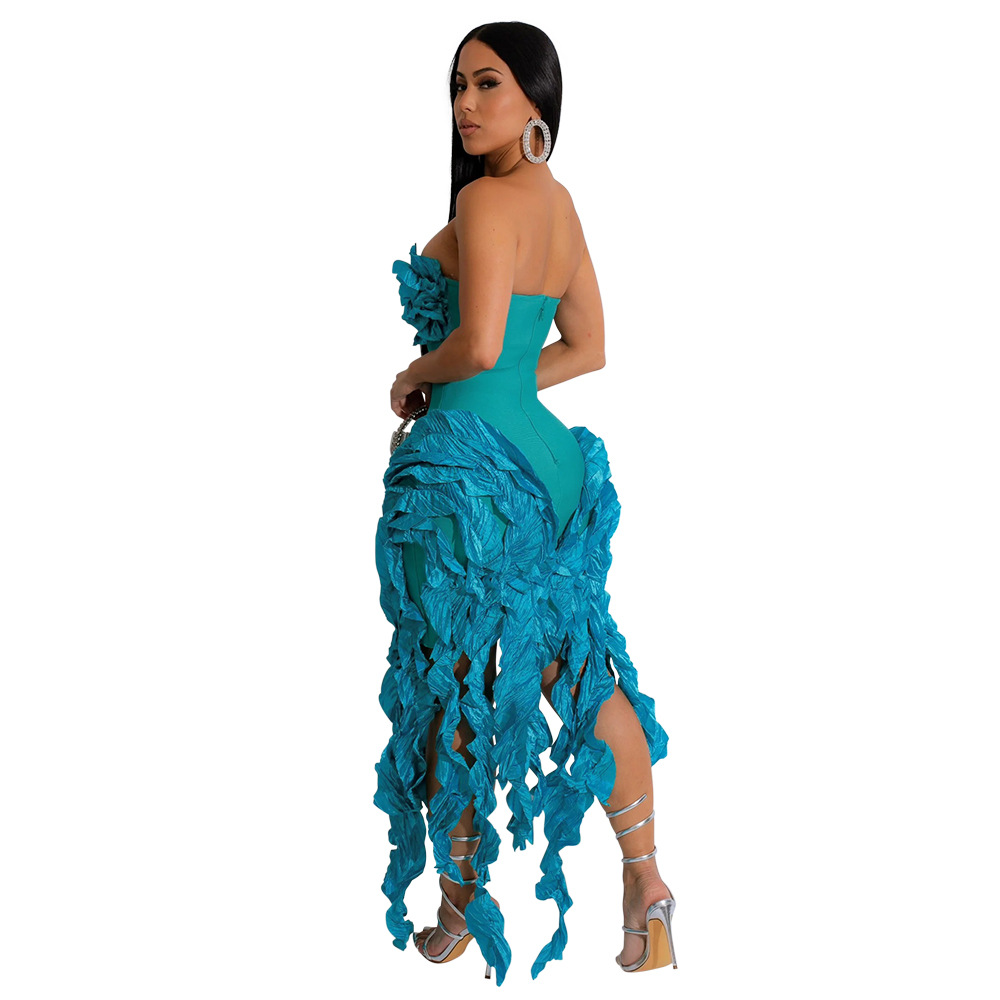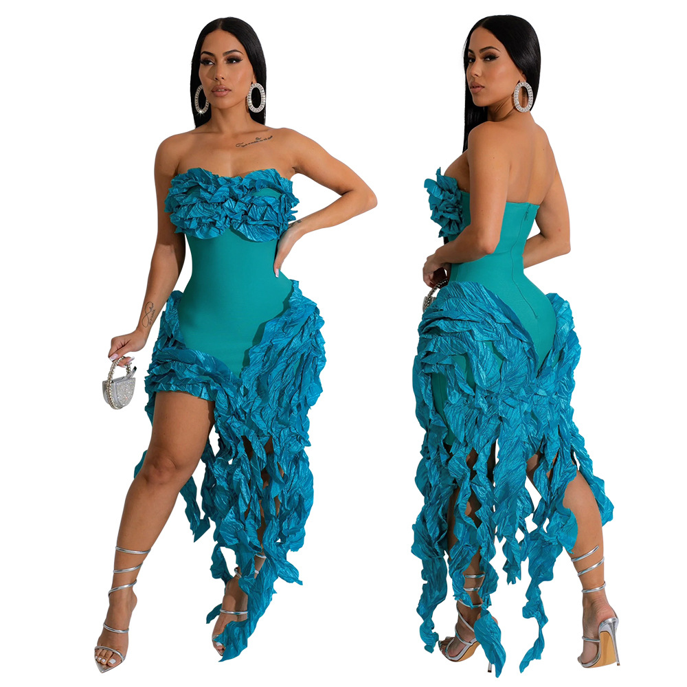 European and American foreign trade Strapless solid dress sexy irregular tassel high split dress women