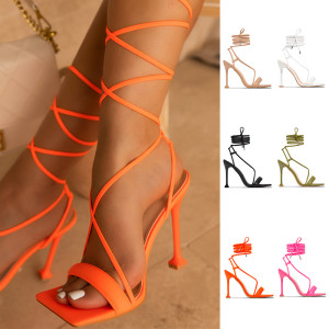 The new summer foreign trade candy color square, the lace is taking a high heel sandals, women's Heles take photos