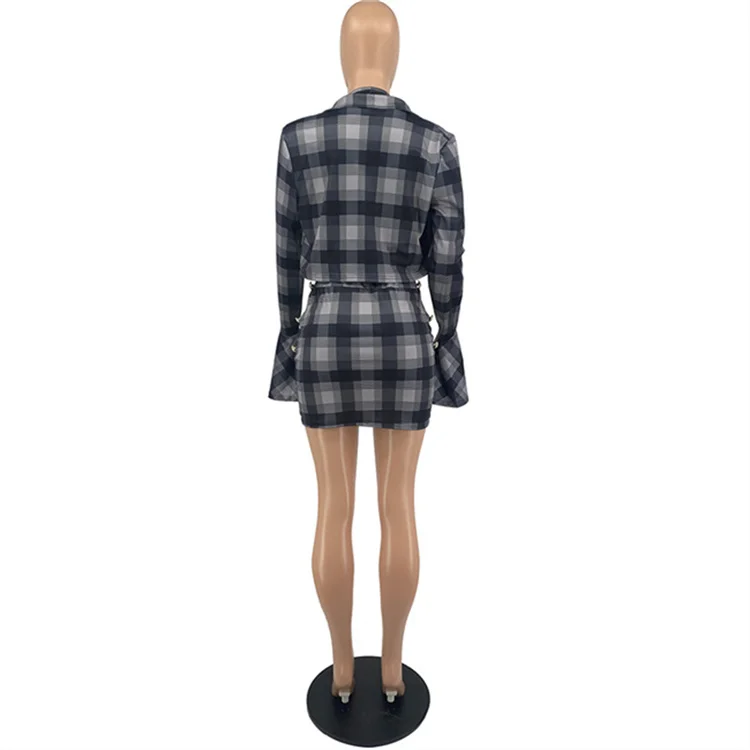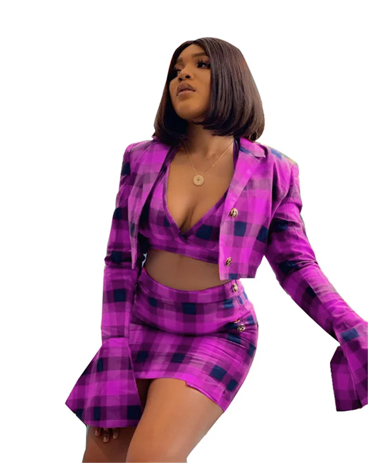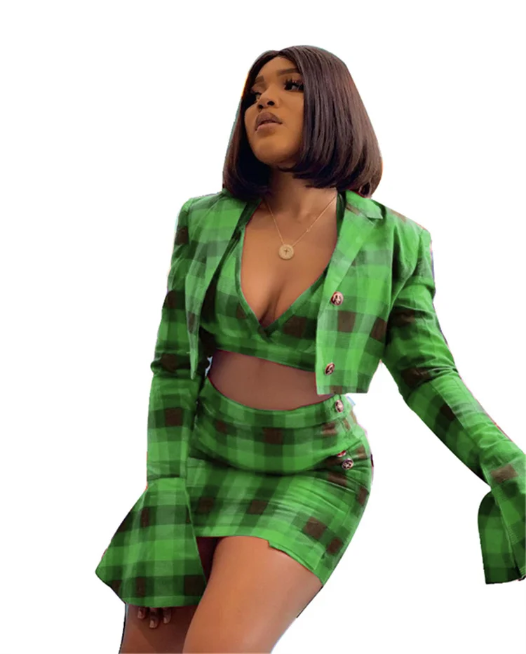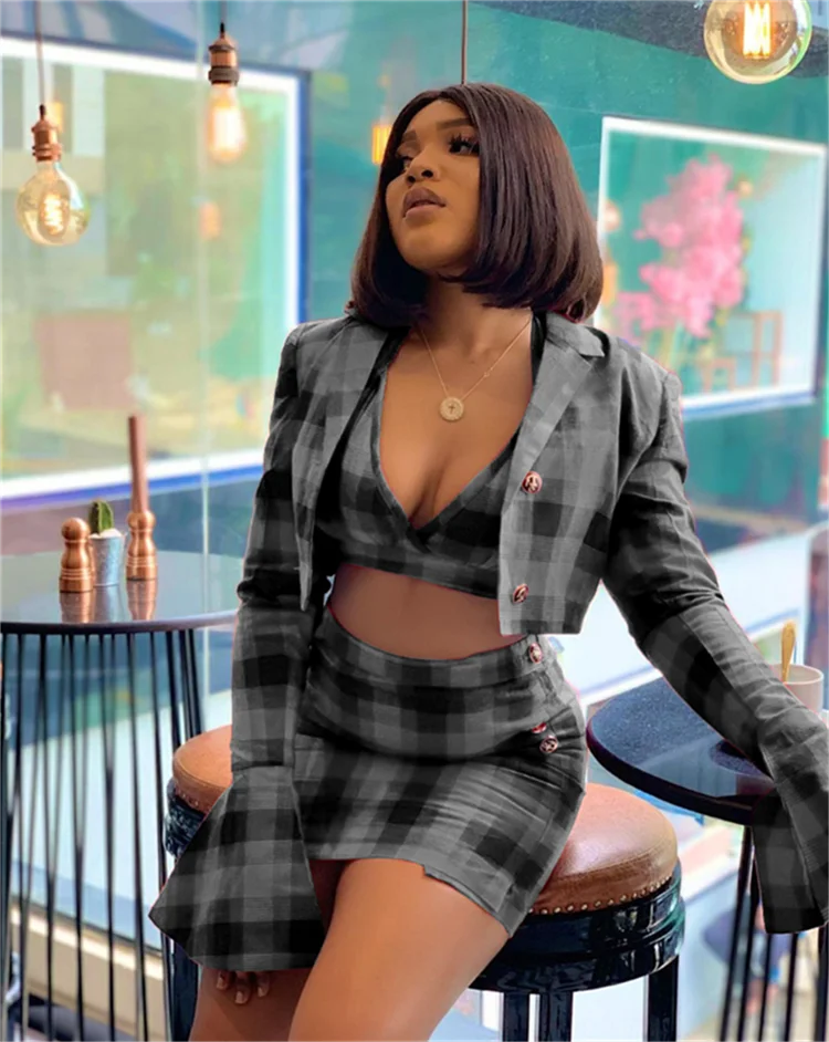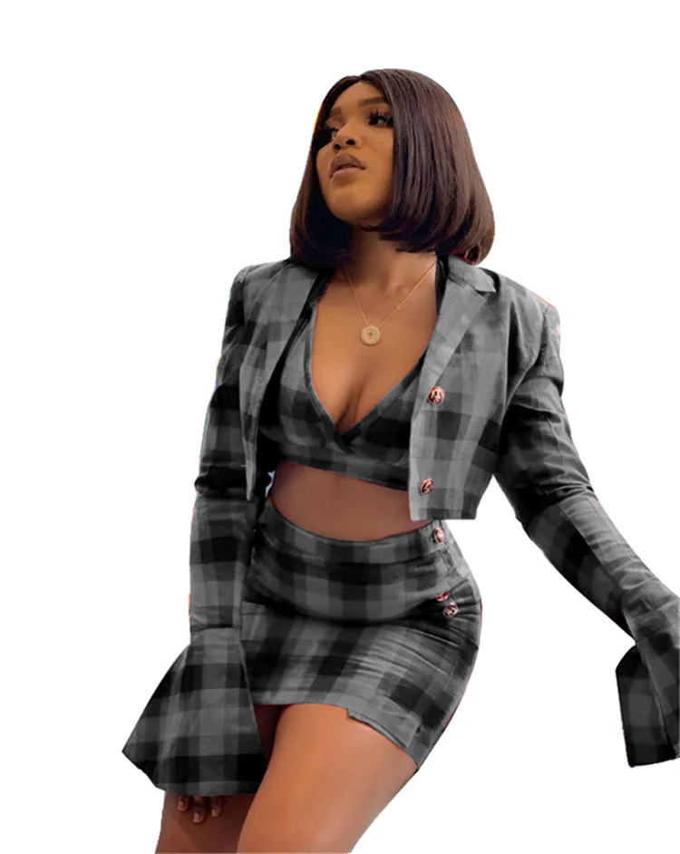 Women Sexy Deep V Neck Crop Top+Flare Sleeve Jacket+Party Club Mini Skirt 3 Piece Set